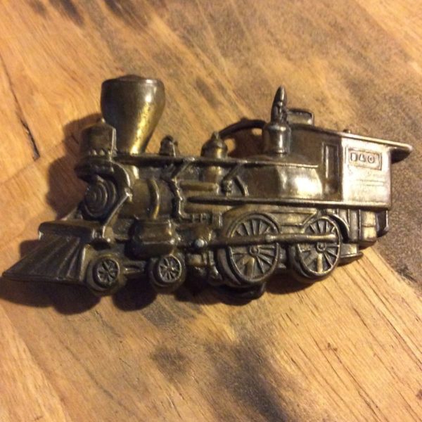 BELT BUCKLE, BRONZE METAL STEAM ENGINE, DARK GOLD