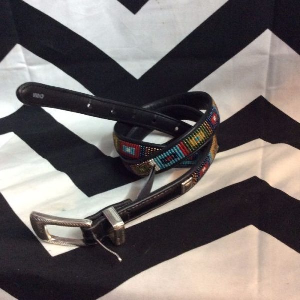 Classic belt, leather, narrow, geometric beaded designs, black/multi, size 34W