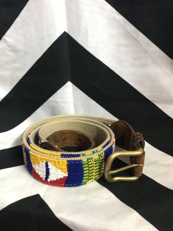 Belt, leather end pieces, woven fabric with rectangle patterns, gold buckle, blue/green/white/red/yellow/brown, size 34″