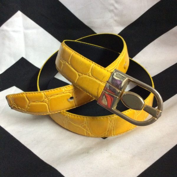 Belt, cow leather, reversible, one side embossed alligator print, one side solid color, brass buckle, yellow/black/gold, size S