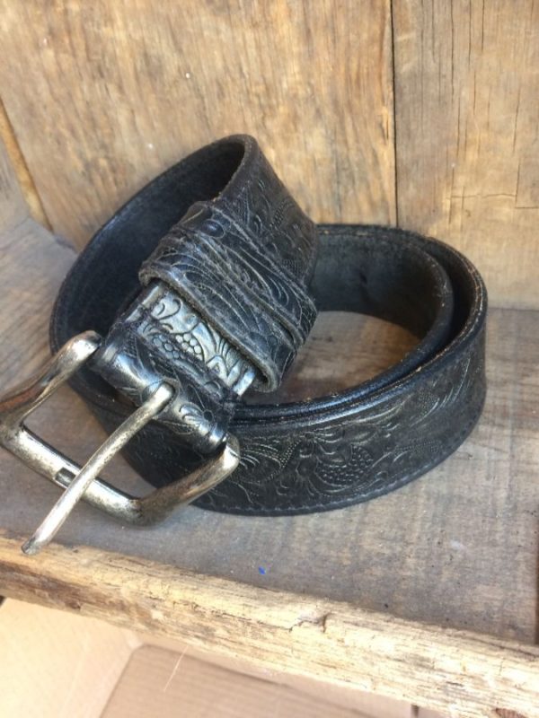 Western belt, genuine full grain leather, embossed & tooled with floral design, silver metal buckle, silver/black, size 36W