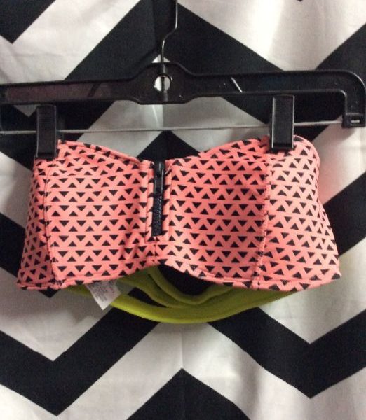 Top, bandeau bikini, zip-up front, triangle graphic design, neoprene, pink/black/neon yellow