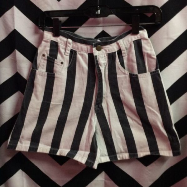 Shorts, zipper, fitted waist, vertical stripe design, belt loops, black/white, size 27-28W