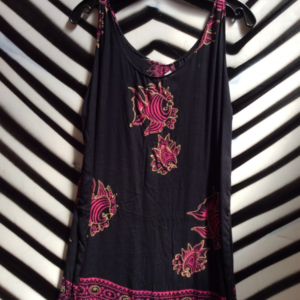 Beach dress, sleeveless, super soft & breezy, black with pink/gold fish print, size M
