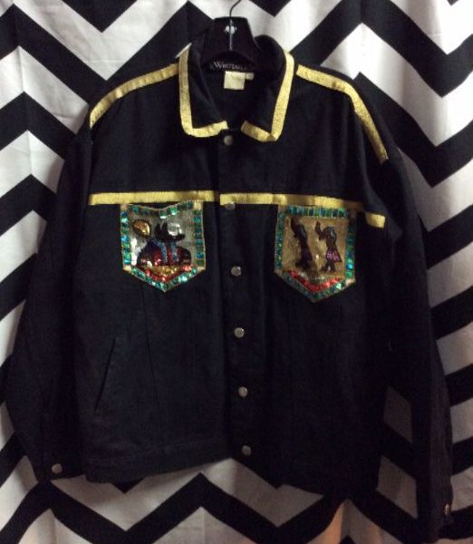 Denim jacket, button-up, Egyptian symbols with sequins, gold trim, black/gold/multi, size M