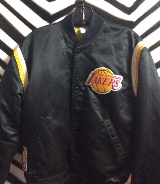 LA Lakers Starter baseball style jacket, button-up, embroidered applique patches, black, size M