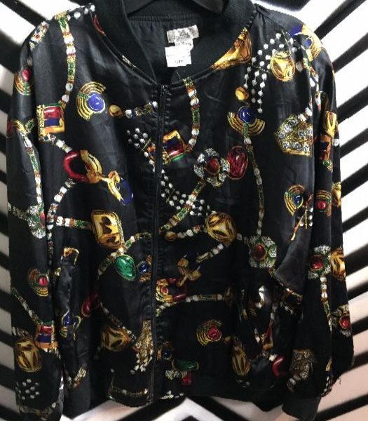 Bomber jacket, zip-up, Baroque pearls and gems design, black/multi-colored, size M