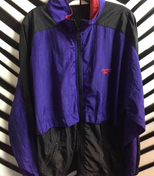 Reebok windbreaker, zip-up, color block design, black/purple/red, size L