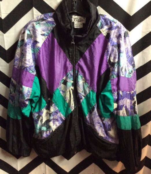 Windbreaker jacket, zip-up, color block design with 1980’s pattern, black/teal/purple/white, size L