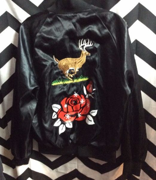 BASEBALL STYLE JACKET – SATIN – SCREEN PRINTED ROSE GRAPHIC ON BACK – EMBROIDERED DEER DESIGN ON CHEST & BACK
