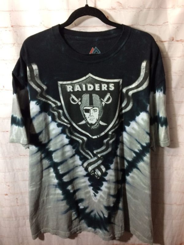 Majestic T-shirt, cotton, tie-dyed, Oakland Raiders, screen printed team logo full front & full back, black/gray/white, size XL