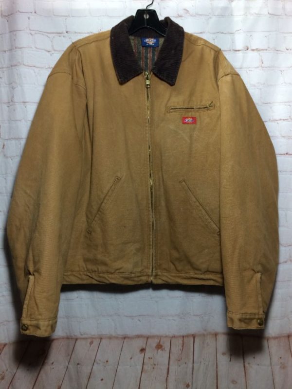 Dickies work jacket, canvas, zip-up, heavy duty, vertical striped blanket lining, corduroy collar, tan/brown, size XXL