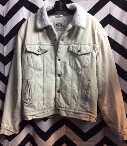 Levis denim jacket, button-up, sherpa lined, bleach washed, bluish white as is