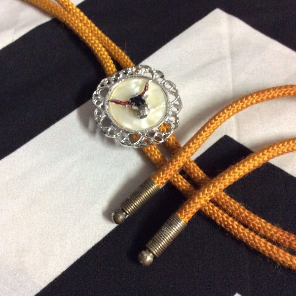 Bolo tie, cow skull decorative slide in silver setting with MOP inlay, yellow orange/white/silver