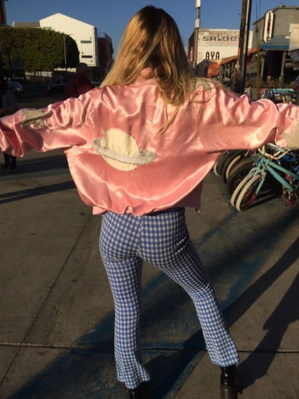LP Designs bomber jacket, satin, button-up with snaps, ribbed collar/cuffs/hem, pastel colors, appliqued stars & moon designs, pink/white/silver As is