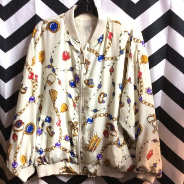 Bomber jacket, zip-up, crown/jewels & chain print, creme/gold/red/blue