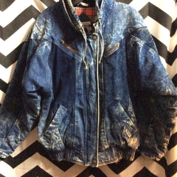 Bomber jacket, denim, zip-up, corduroy patchwork on outside of sleeves & back inserts, plaid design flannel lining, drawstring cinched waist, acid washed denim, blue/navy/red, size M