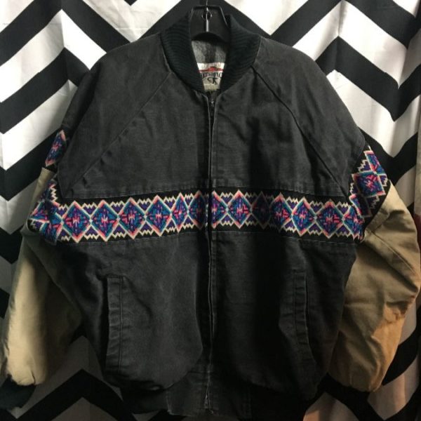 BOMBER JACKET DENIM WOOL LINING AZTEZ/ GEOMETRIC PATTERN STRIP