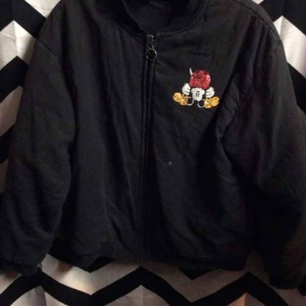 Bomber jacket, zip-up, Mickey Mouse, screen printed left chest and full back designs plus beads & sequins on butt & feet, black/red/white/yellow, size S as is