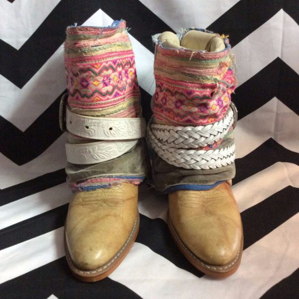BOOTS – RECYCLED – ADDED DENIM & PRINT CUFFS W/BELTS – ONE OF A KIND