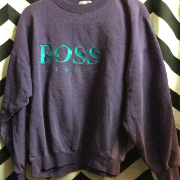 Pullover sweatshirt, Boss America, embroidered full front design, purple/teal, size M