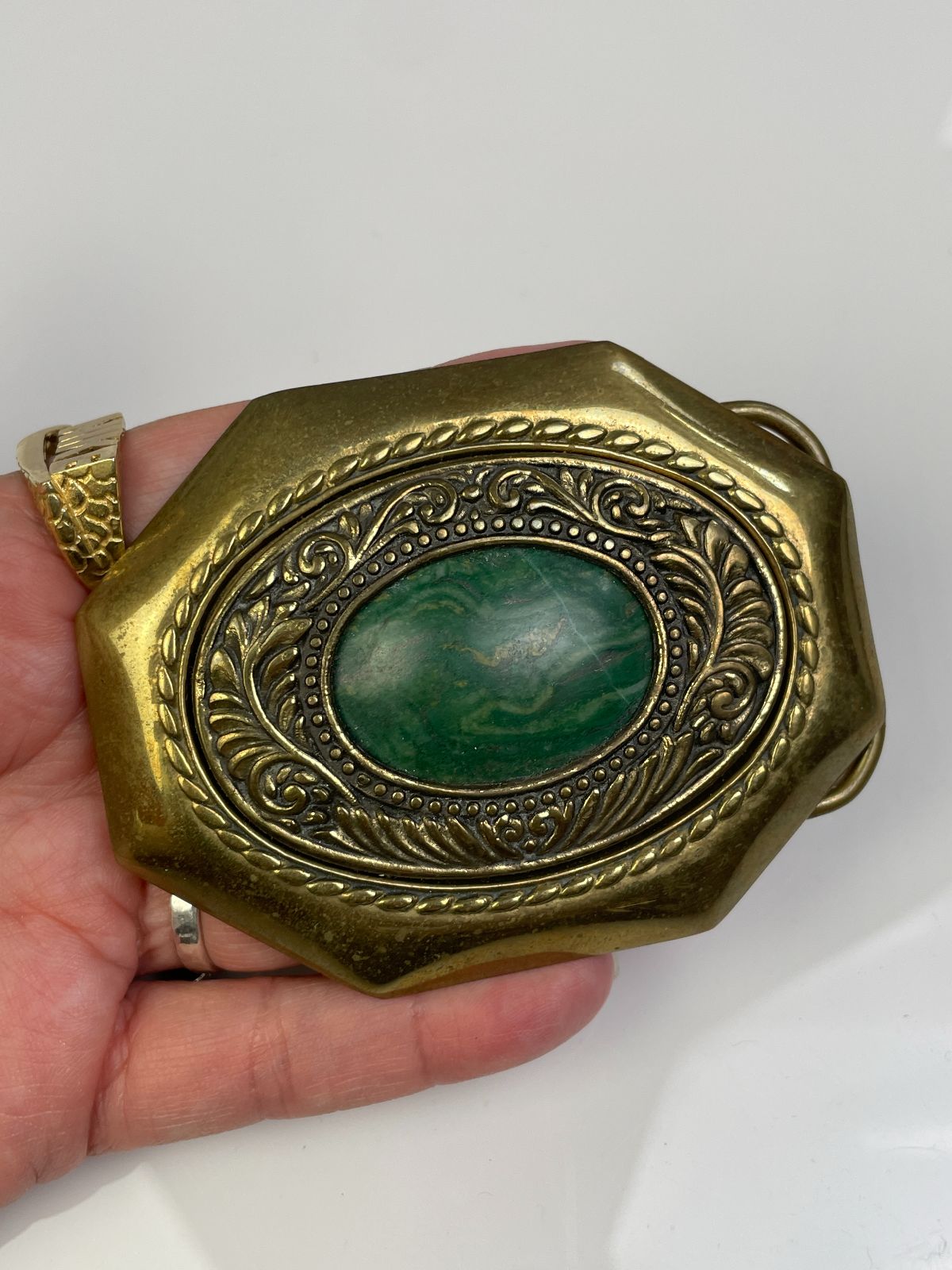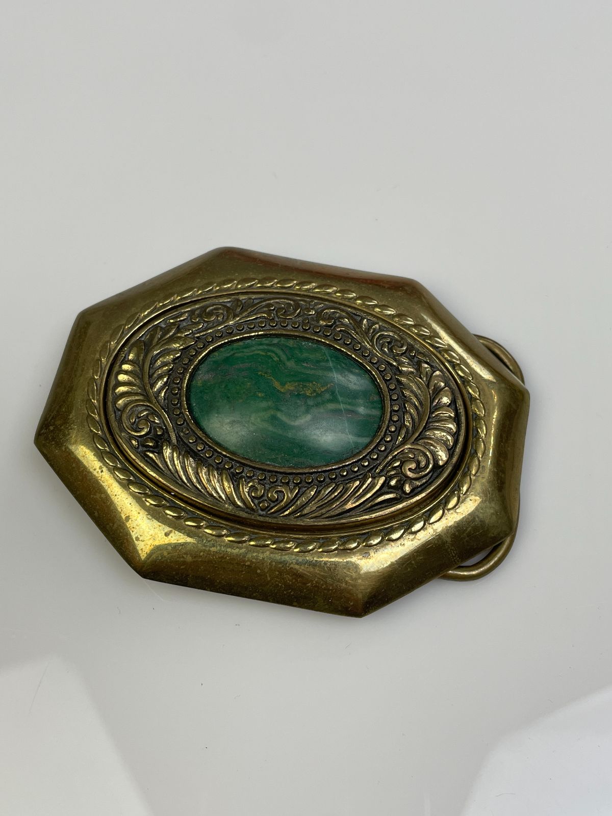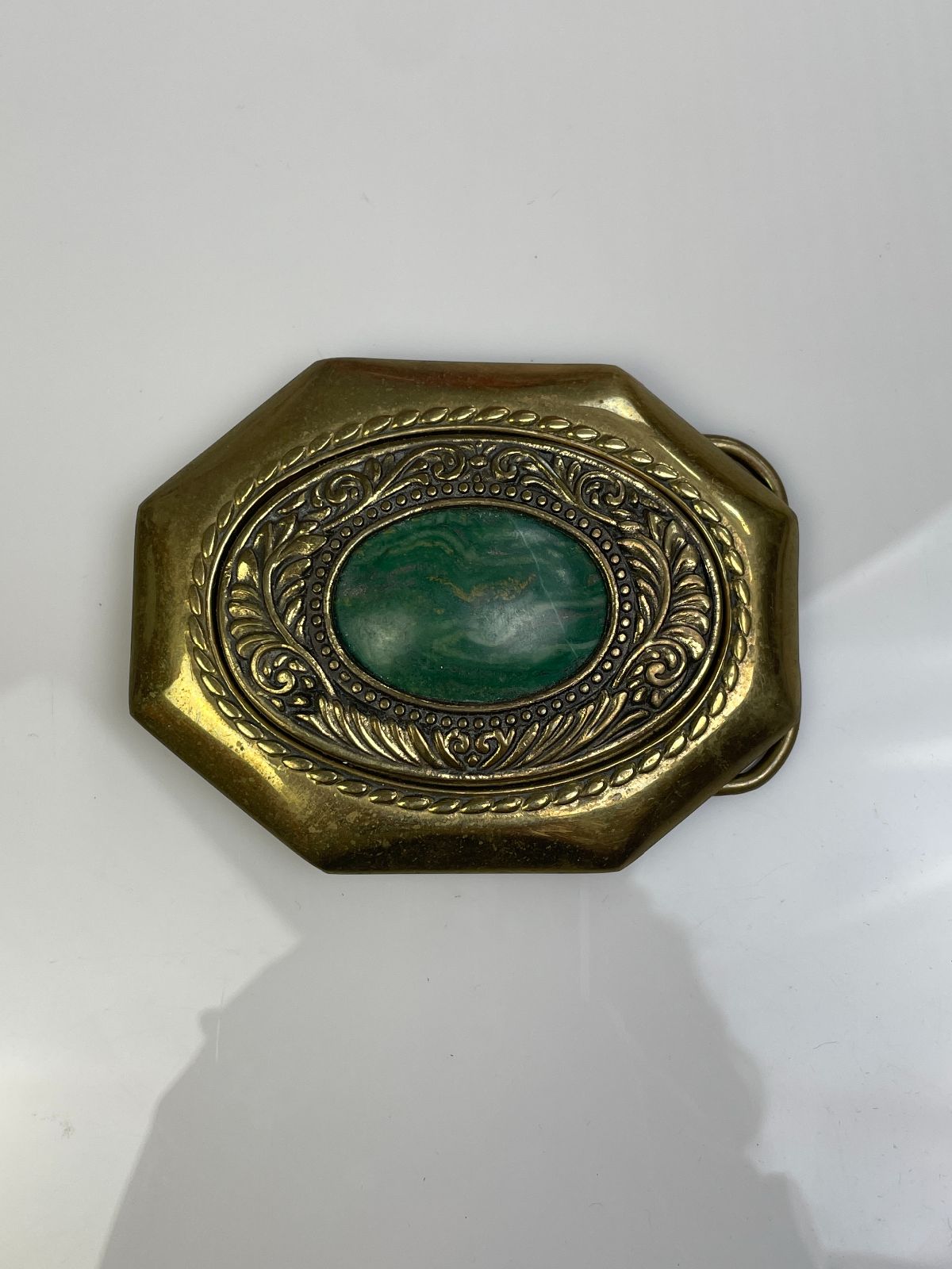 BRASS BELT BUCKLE, GREEN STONE ORNATE DESIGN BORDER