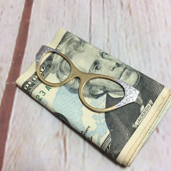 Money clip, decorative cat-eye style glasses, 2 toned, brass & silver metal, little flower designs on corners, gold/silver