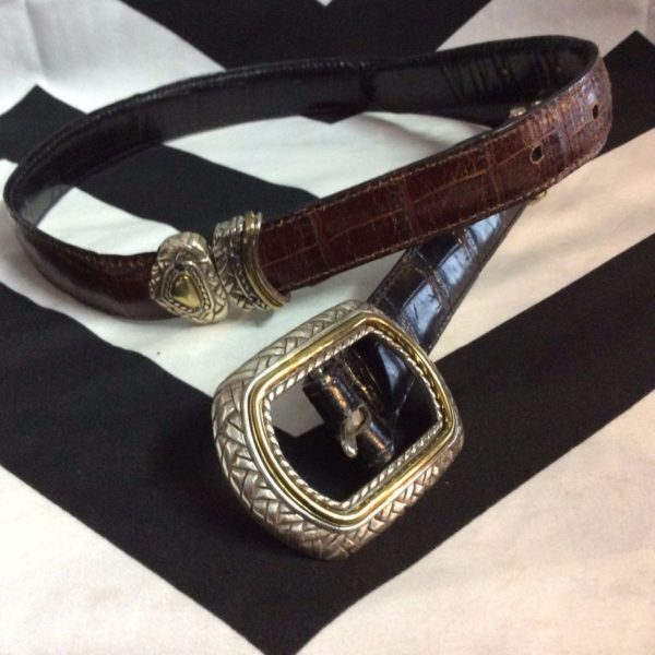 Brighton belt, leather, reversible, ornate buckle and loop, brown/black/brass, size S