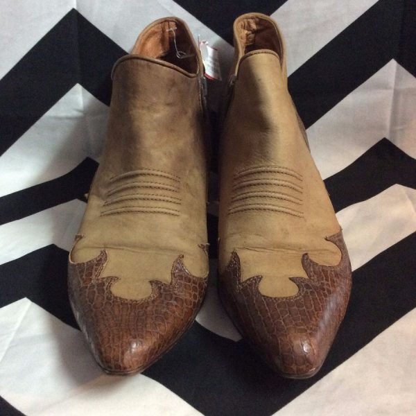 Paloma boots, pointed toe, low rise, ankle high, crocodile detail on toe and heel, brown/tan, size 9
