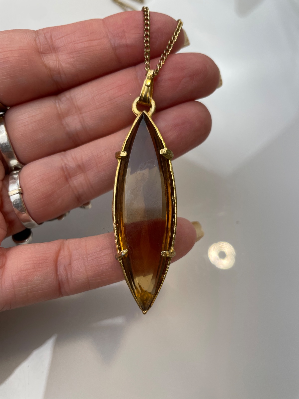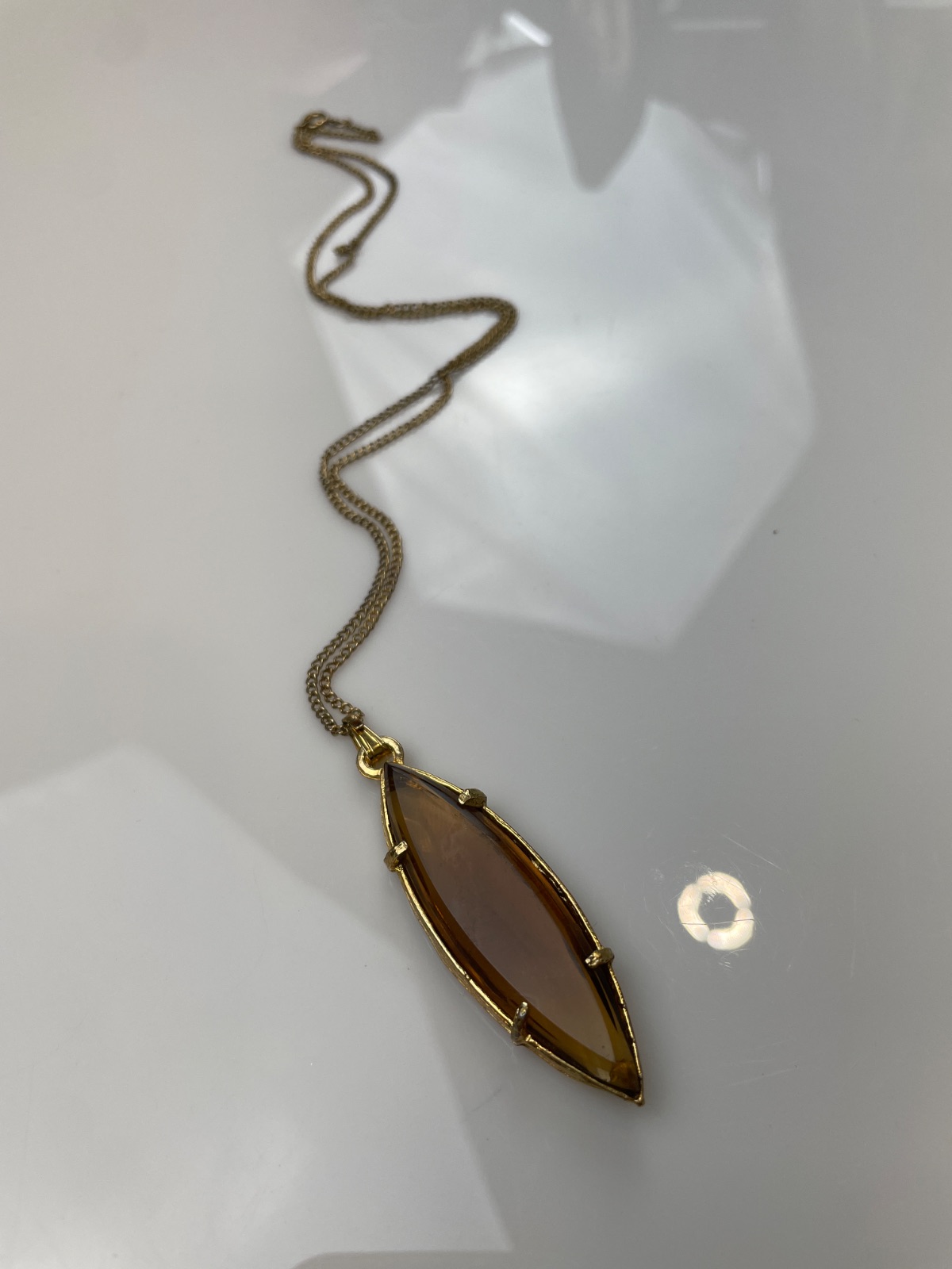 RETRO 1970S AMBER GLASS PENDANT NECKLACE THIN LONG BRASS METAL CHAIN