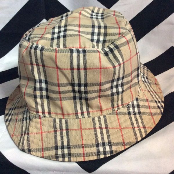 Bucket hat, Burberry style, plaid design, tan/white/black/red