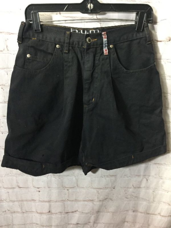 Bum Equipment denim shorts, zip-up fly, cuffed hem, front & back pockets, black, size 32W