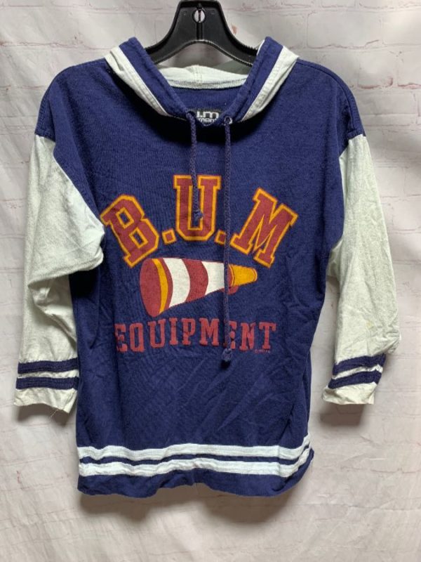 Bum Equipment shirt, pullover, long sleeves, hooded with drawstring, striped trim on hoodie/sleeves/hem, screen printed front graphic, blue/white/burgundy/gold, size S As is