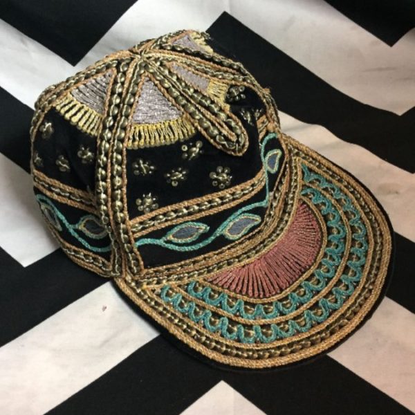 Baseball style cap, ethnic Burmese Myanar fancy embroidered hat, black/gold/turquoise