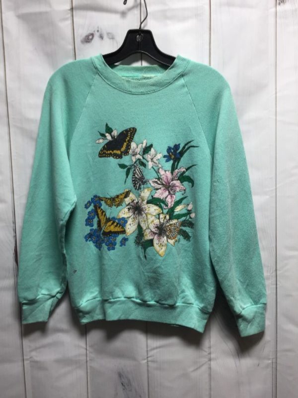 SWEATSHIRT, PULLOVER, BUTTERFLIES & FLOWERS DESIGN PRINT, SCREEN PRINTED FULL FRONT GRAPHIC, TURQUOISE/LAVENDER/GREEN/BLUE/OLD GOLD, SIZE S