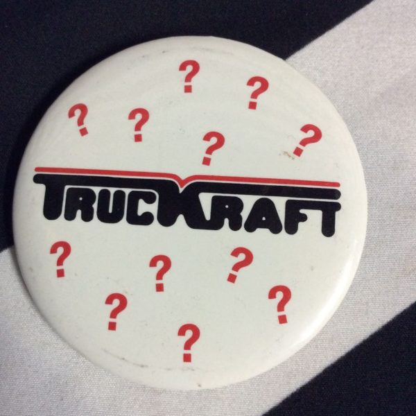 Button/pin, TrucKraft with questionmarks, white/red/black