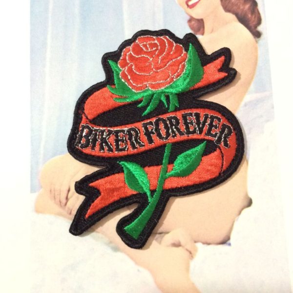 BW embroidered patch, red rose with lettering Biker Forever on banner, red/white/black/green