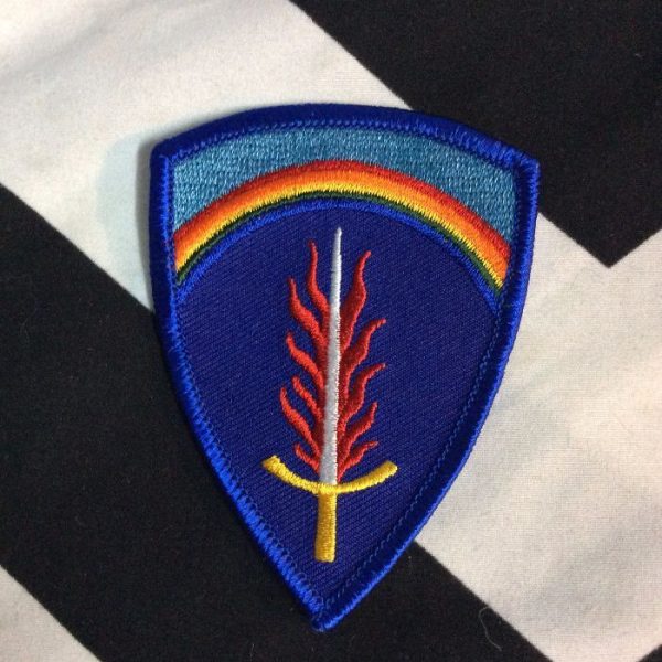 BW patch, flaming sword with rainbow over top, shield shape, blue/red/yellow/orange/green