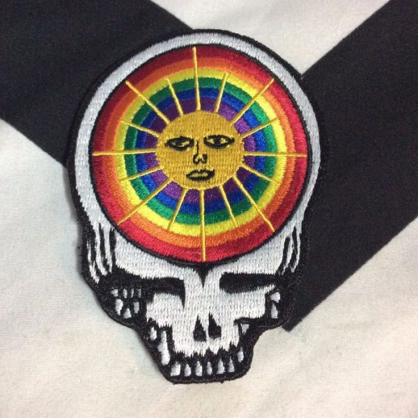 BW embroidered patch, Dead Head, Rainbow circle around sun, white/black/multi, size 2.25″ x 3.25″