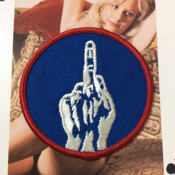 BW embroidered patch, round shape, middle finger salute, contrasting outline, blue/red/white, size 3″