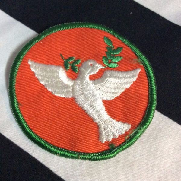 1960’s BW embroidered patch, dove with olive branch, peace, orange/white/green, size 3″