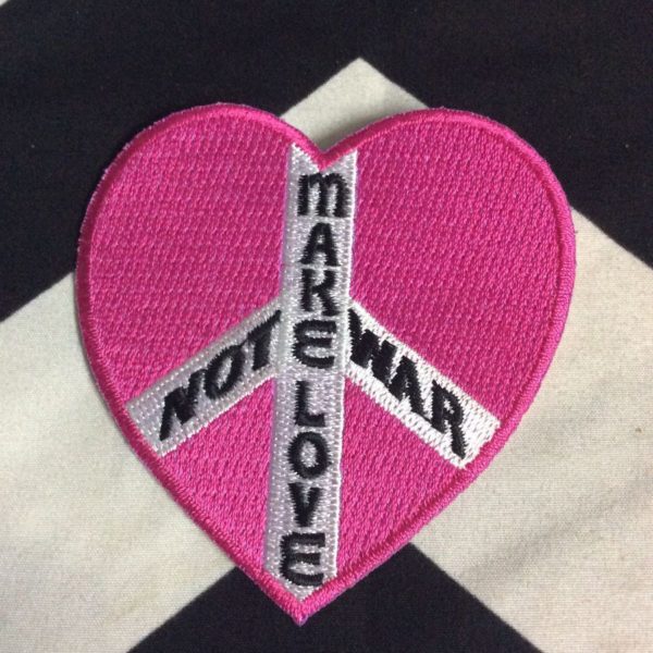 BW embroidered patch, heart shape, Make Love Not War lettering, pink/white/black