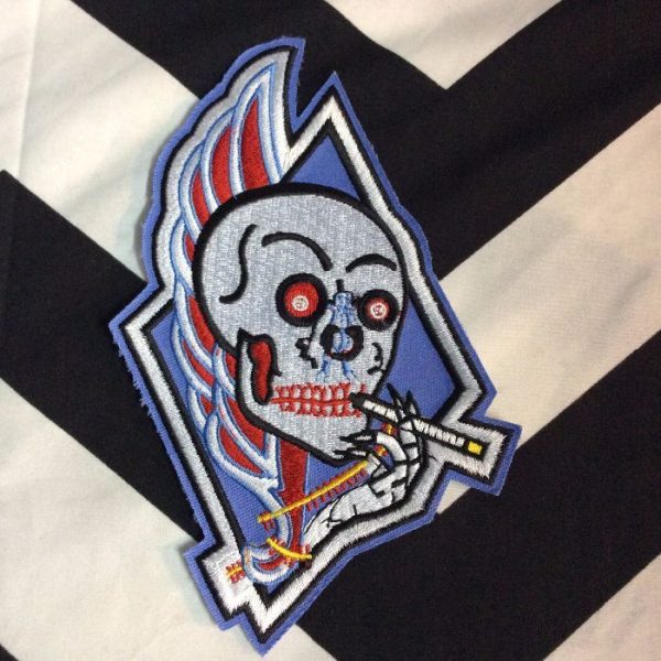 LIGHT BLUE DIAMOND PATCH WITH SKULL WITH WINGS AND SKELETON HAND HOLDING A LIT CIGARETTE