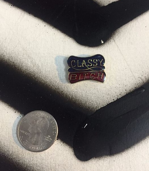 BW pin, says “Classy Bitch”, black/red, size of quarter