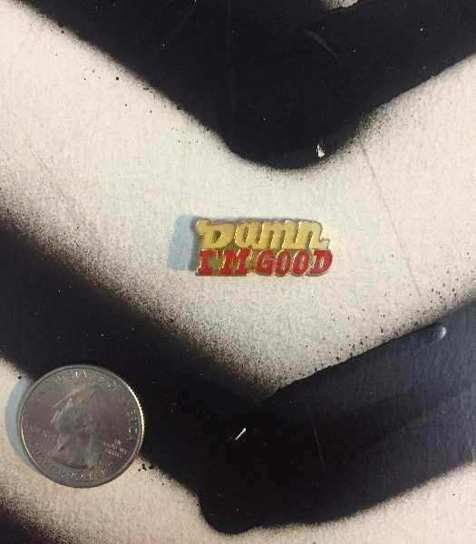 BW pin, says “Damn I’m Good”, red/yellow, size of quarter