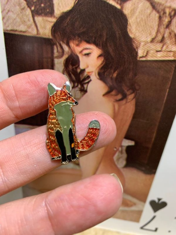 BW PIN, SITTING FOX, RUST/GREY/BLACK, SIZE OF QUARTER