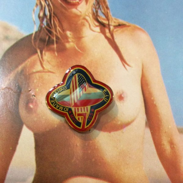 BW ENAMEL PIN, BORROMEAN CROSS SHAPE (4 CONNECTED CIRCLES), NASA, USA FLAG CENTER DESIGN & 7, MKC, ISS, E. LU, IO MANEHKEHKO, RED/WHITE/BLUE
