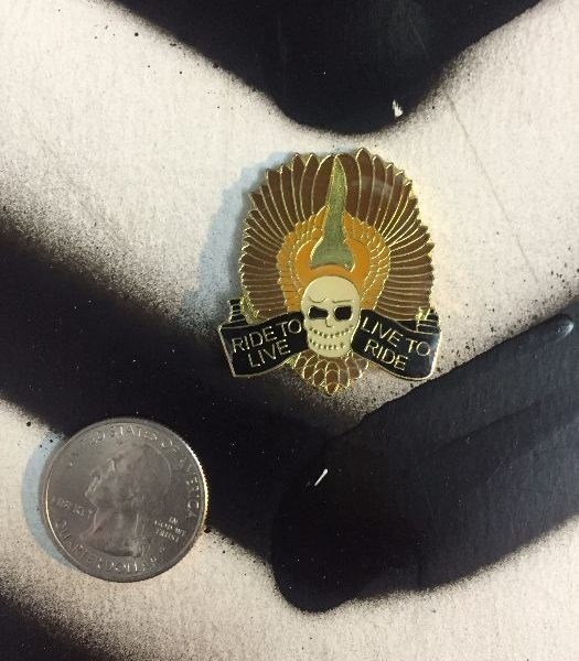 BW pin, skull with feathers and “Ride to Live, Live to Ride, size of quarter