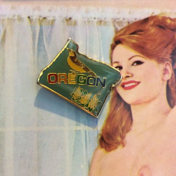 Vintage BW enamel pin, Oregon state, collectable, state outline/bird & state flower, teal/gold/brown/green