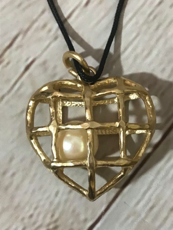1980’s necklace, gold vermeil open cage heart pendant with pearl inside, strung on cord, pearl white/matte gold/black